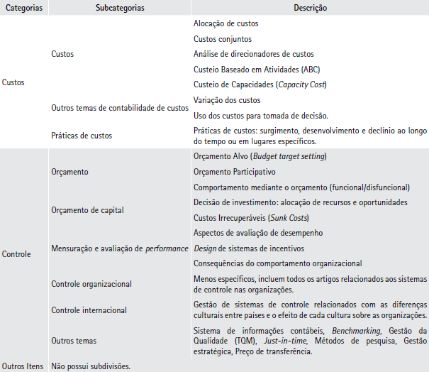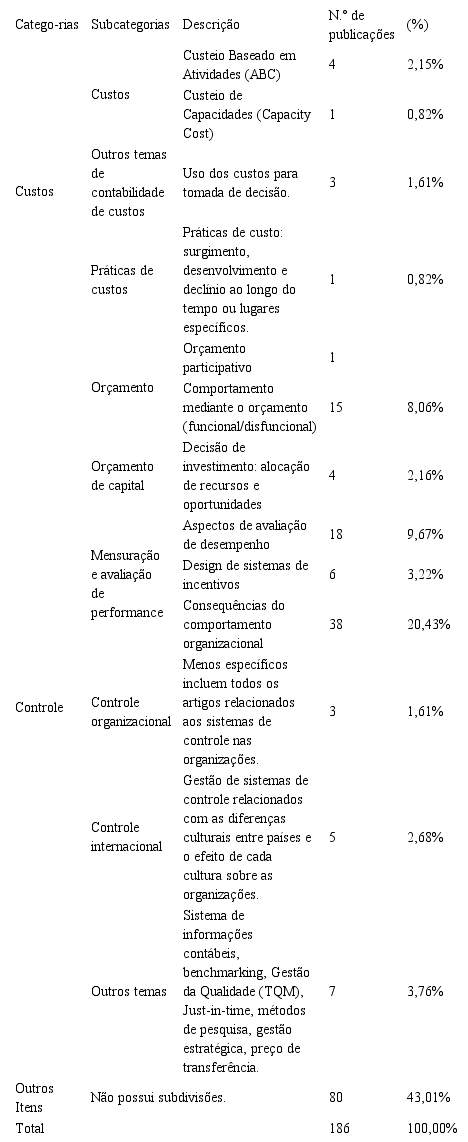 No que concerne à categoria Controle, percebe-se que a subcategoria Mensuração e Avaliação de Performance destacou-se dentre as demais subcategorias, correspondendo a uma presença de 33,32% nos artigos veiculados pela AOS. O item Consequências do comportamento organizacional representou isoladamente 20,43%, seguido pelo item Aspectos de avaliação de desempenho com 9,67% e Design de sistemas de incentivos, com 3,22%. Na categoria Custos, a subcategoria que se sobressaiu foi Custos, no item Custeio Baseado em Atividades (ABC), encontrada em 2,14% dos estudos analisados.