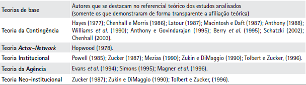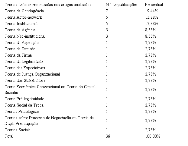 As teorias de base foram expressas na introdução e no referencial teórico em 36 dos 186 artigos analisados. Naqueles artigos, observou-se que a Teoria da Contingência foi a principal base teórica utilizada, seguida de posição compartilhada pela Teoria Actor-network e pela Teoria Institucional, sendo a terceira posição compartilhada pela Teoria da Agência e pela Teoria Neo-institucional. Relativamente aos autores que sustentam as teorias de base dessas publicações, ou seja, os que foram citados para consubstanciar as teorias mais utilizadas nos 36 artigos que declararam de forma explícita a teoria de base, cada uma dessas teorias foi embasada em autores específicos.