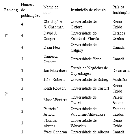 Na Tabela 5, verifica-se que Christopher S. Chapman, da Universidade de Oxford, do Reino Unido, David J. Cooper, da Universidade do Estado da Flórida, e Dean Neu, da Universidade de Calgary, do Canadá, revelaram-se como os pesquisadores mais prolíficos na AOS, todos com quatro publicações no período analisado.
