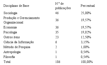 Este item contempla as disciplinas de base encontradas nos estudos científicos analisados, de acordo com a classificação proposta por Hesford et al. (2007) que as dividiram em: Economia, Produção e Gerenciamento Organizacional, Psicologia, Sociologia e Outros itens. A partir da pesquisa documental, sentiu-se a necessidade de criar quatro classificações adicionais, sendo elas: Antropologia; Ciência da Informação; Filosofia; e Método de Pesquisa. Na Tabela 7, apresentam-se as disciplinas de base dos artigos analisados.