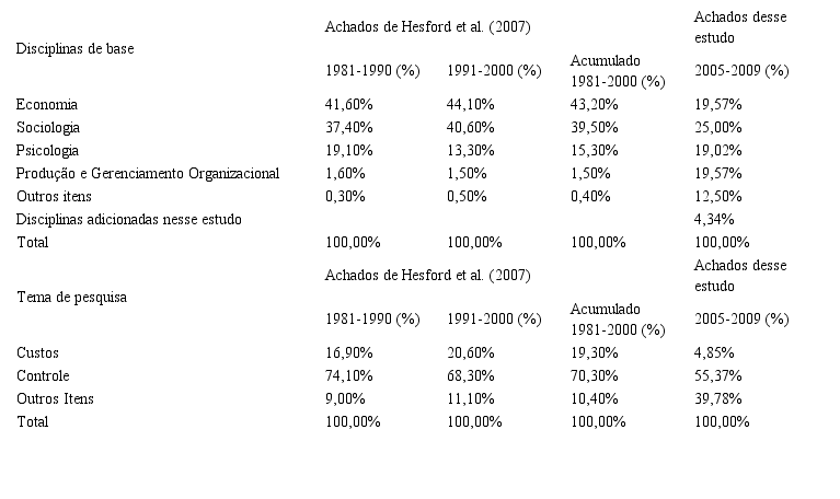 Comparando-se os achados desta pesquisa com a realizada por Hesford et al. (2007), verifica-se que os resultados coadunam-se em parte. Enquanto Hesford et al. (2007) identificaram como principal disciplina a Economia para sustentar estudos de Contabilidade Gerencial no período de 1981 a 2000, nesta pesquisa ela consta em segundo lugar, empatada com a disciplina de Produção e Gerenciamento Organizacional, que foi pouco representativa na pesquisa dos autores. A principal disciplina de base nesta pesquisa foi a Sociologia, que, na pesquisa de Hesford et al. (2007), também foi representativa. Quando analisadas em conjunto, as disciplinas de Sociologia e Psicologia, em ambas as pesquisas, foram as mais comumente encontradas nas publicações da AOS.