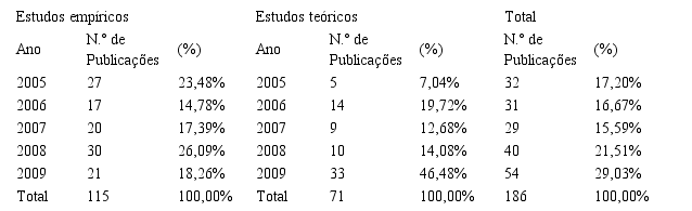 Referente às características gerais dos artigos publicados na AOS no período de 2005 a 2009, constatou-se um crescimento significativo no número de artigos publicados nos anos de 2008 (40 publicações) e 2009 (54 publicações) em relação aos anos de 2005 (32), 2006 (31) e 2007 (29). Tal fato ocorreu sem edições especiais do periódico, portanto, parece indicar um aumento no fluxo de artigos, já que essa tendência de crescimento também foi detectada na pesquisa de Hesford et al. (2007) no período de 1981 a 2000.