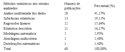 Em se tratando dos métodos quantitativos aplicados nos artigos analisados, verificou-se que a análise multivariada dos dados está presente em 41,17% e as inferências estatísticas são encontradas em 19,11% dos estudos empíricos que utilizaram ferramentas estatísticas para análise dos dados. Denota-se a preocupação dos autores das publicações pesquisadas com uma análise mais elaborada dos dados, utilizando-se de modelos quantitativos mais sofisticados para as inferências na análise dos resultados.