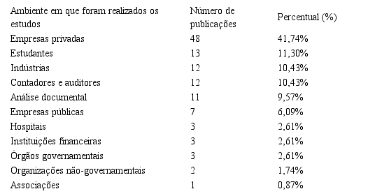 O ambiente em que foram realizados os 115 estudos empíricos publicados na AOS, no período analisado, consta na Tabela 3. A identificação do ambiente de realização das pesquisas pode indicar possíveis preferências de campo dos autores, ou ainda indicar a existência ou não de preferências do editor do periódico por determinados ambientes.