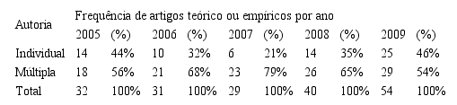 Observa-se, na Tabela 4, que, durante o período analisado, as autorias múltiplas se sobressaíram em relação às autorias individuais. O ápice ocorreu no ano de 2007, que apresentou 79% das publicações com autorias múltiplas, ou seja, artigos científicos publicados com dois ou mais autores, mas verifica-se uma tendência de declínio nos anos subsequentes, com 65% (2008) e 54% (2009).