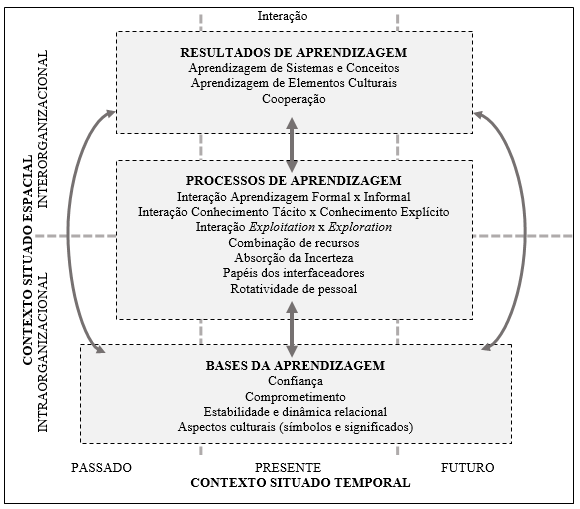 Nesse ínterim, a seguir, apresenta-se o esquema conceitual (Figura 5), oriundo da relação entre o referencial teórico (Figura 1) e os resultados do estudo (Figuras 3 e 4). Tendo em vista os relacionamentos e a aprendizagem interorganizacionais, o esquema é composto inicialmente, pelo contexto de característica situada (Antonello e Godoy, 2010. Elkjaer, 2004; Gherardi, 2005; Nicolini et al., 2003), dividido em dois eixos, temporal e espacial conforme Nonaka et al. (2011). O contexto temporal é composto pelo passado (experiências e trajetórias dos indivíduos, ações e organizações envolvidas), presente (a situação das interações atuais) e futuro (tendências, expectativas e anseios). O contexto espacial está associado aos níveis intraorganizacional e interorganizacional.