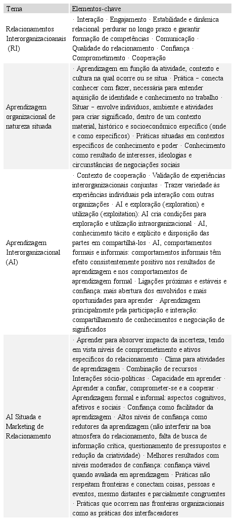 As bases da aprendizagem, compostas por confiança, comprometimento, estabilidade e dinâmica dos relacionamentos e aspectos culturais (Antonello e Godoy, 2010; Batt e Purchase, 2004; Child, 2001; Gherardi, 2005; Holmqvist, 2003; Knight, 2002; Lane, 2001; Nicolini et al., 2003; Palmatier et al., 2006; Selnes e Sallis, 2003), possibilitam sustentação aos processos de aprendizagem, bem como contribuem para suas caracterizações. Os processos de aprendizagem envolvem interações entre aprendizagem formal e informal (Antonello, 2011; Janowicz-Panjaitana e Noorderhavenb, 2008), conhecimento tácito e explícito (Child, 2001) e exploration e exploitation (Holmqvist, 2003). Contribuem para tais interações e desenvolvem-se a partir delas a combinação de recursos (Hardy et al., 2003; Selnes e Sallis, 2003), a absorção da incerteza (Selnes e Sallis, 2003) e os papéis desempenhados pelos interfaceadores (Child, 2001), além do seu nível de rotatividade (Pettersen, 2001). Os resultados de aprendizagem envolvem tanto aprendizagem de sistemas e conceitos quanto elementos culturais, bem como o desenvolvimento de cooperação. Optou-se por colocar cooperação como um resultado por ser produto da confiança e do comprometimento (Palmatier et al., 2006) e por depender da aprendizagem (Knight, 2002; Selnes e Sallis, 2003).