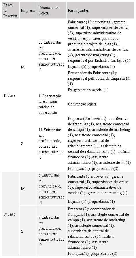 A coleta de dados ocorreu em duas fases distintas em ambos casos (Figura 2). Na primeira fase, foram realizadas, na empresa M e com lojistas, vinte entrevistas pessoais em profundidade, sendo cinco com os lojistas, de dezembro de 2008 a agosto de 2009, e uma observação de uma Convenção de Lojistas, em agosto de 2009, utilizando-se de roteiro semiestruturado e de roteiro de observação respectivamente. Na Empresa S e com os franqueados, foram realizadas onze entrevistas em profundidade (duas com as franquias), com os mesmos roteiros utilizados para a Empresa M, de julho a setembro de 2009. Não foi autorizado uso de observação por essa empresa. Todas as entrevistas foram gravadas e transcritas. A escolha de quais funcionários das empresas participariam partiu do critério de definição de profissionais com maior interação com os intermediários. A escolha dos intermediários ocorreu por nível de relacionamento (alta e baixa qualidade), indicado pelas empresas.