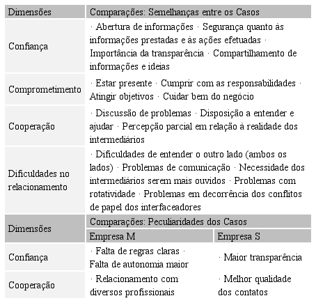 Em ambas as empresas, a qualidade dos relacionamentos foi considerada boa pelos entrevistados. Contudo, isso ficou mais evidenciado na Empresa S do que na Empresa M, principalmente quanto à confiança, às ações de interação e à cooperação e aos processos de aprendizagem. Paralelamente, os funcionários das empresas tendem a perceber os relacionamentos de maneira um pouco mais positiva que os intermediários, sem haver, todavia, grandes diferenças. Mesmo que os canais de marketing considerados tenham, em sua concepção, acordos contratuais, essa questão, conforme os achados, parece não limitar os processos sociais e culturais associados ao relacionamento, como comprometimento e confiança.