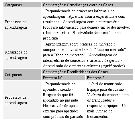 Em relação às diferenças em ambas as empresas, pode-se perceber que a Empresa S faz maior uso de técnicas e procedimentos de ensino e aprendizagem, valendo-se, além de treinamento, das trocas de ideias, das discussões e experiências, que, muitas vezes, ocorrem em reuniões. A Empresa M, por outro lado, depende mais do aprendizado oriundo das experiências (aprender fazendo). Importa ressaltar, nesse caso, que se iniciou, em meados de 2009, um processo de reconhecimento e resgate dos conhecimentos produzidos no passado. Isso ficou evidenciado na Convenção de Lojistas, indicando a retomada do “conceito” e dos seus pilares, bem como na contratação de consultoria para treinamentos e avaliação do desempenho das lojas.