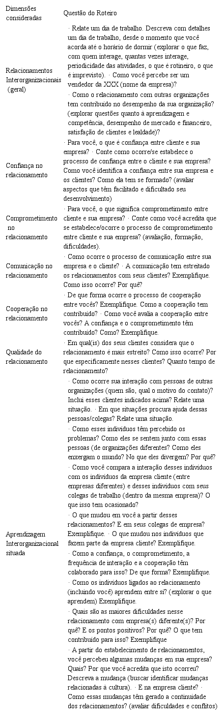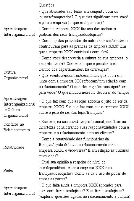 A partir dos resultados das primeiras fases associados ao referencial teórico, elaborou-se um segundo roteiro semiestruturado para as entrevistas em profundidade. A segunda fase, na Empresa M, ocorreu em dezembro de 2009, sendo seis entrevistas, uma com lojista. Na empresa S, foram nove entrevistas, duas com franquias. O número de entrevistas, em todas as fases, foi baseado no critério da redundância (Merrian, 2009). Destaca-se, ademais, que os roteiros de entrevistas utilizados nas empresas e nos intermediários eram praticamente os mesmos, com algumas adaptações de palavras de referência ao entrevistado. No apêndice, encontram-se os roteiros utilizados junto às empresas fornecedoras, com a indicação das dimensões norteadoras.