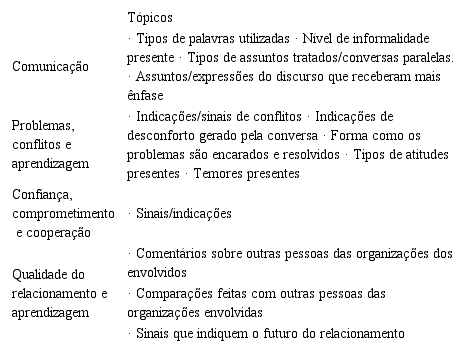 De acordo com os entrevistados, de forma geral, a importância do relacionamento deveria estar evidente através do nível de preocupação em cumprir o que se prometeu, na troca constante de informações, no entrosamento entre as equipes, na transmissão de segurança no que se faz, na disposição em aprender, a entender o que ocorreu e em resolver os problemas. Fica clara, nesse caso, a presença dos elementos centrais das estratégias interorganizacionais: confiança, comprometimento e cooperação (Palmatier et al., 2006), bem como a importância da aprendizagem (Batt e Purchase, 2004).