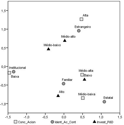 Através dos resultados da Análise de Correspondência Múltipla (ACM), verificou-se que há uma relação entre os investimentos em P&D e os aspectos da estrutura de propriedade (concentração acionária e identidade do acionista controlador). Dentre os achados, convém destacar que as empresas sob o controle estrangeiro registram alta concentração acionária, embora apresentem altos investimentos em P&D. Ressalta-se que resultado semelhante fora encontrado para empresas sob o controle familiar.