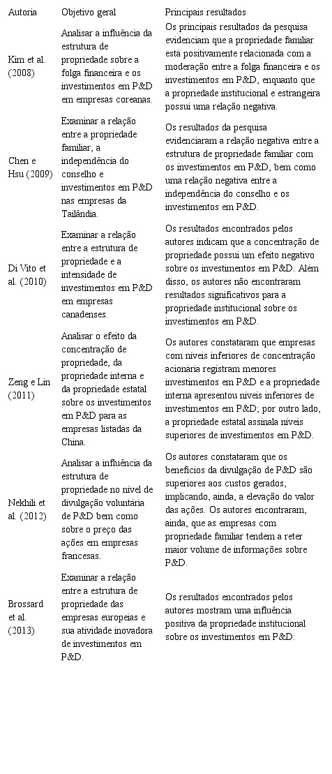No contexto internacional, diversos estudos abordam a relação entre estrutura de propriedade e investimentos em P&D. No âmbito empresarial dos EUA, sobressai o estudo de Di Vito et al. (2010); já no contexto asiático, há os de Kim et al. (2008), Chen e Hsu (2009) e Zeng e Lin (2011); por fim, no contexto europeu, destacam-se as pesquisas de Nekhili et al. (2012) e Brossard et al. (2013). O Quadro 1 apresenta o objetivo geral e os principais resultados de cada uma das seis obras ora destacadas.