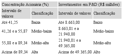 Para tanto, as variáveis utilizadas na ACM – identidade do acionista controlador, concentração acionária e investimentos em P&D – foram transformadas em variáveis nominais. Desse modo, a identidade do acionista controlador foi classificada em familiar, estrangeira, institucional e estatal. Para enquadramento da concentração acionária e os investimentos em P&D, recorreu-se à aplicação de quartis; assim, a classificação dessas duas variáveis foi definida conforme mostra o Quadro 2.
