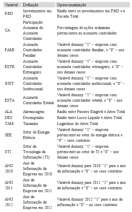 Optou-se por utilizar as variáveis de controle alavancagem, desempenho, tamanho e setor, por haverem sido aplicadas em outros estudos, nos quais foram definidas como fatores determinantes dos investimentos em P&D (Barker III e Mueller, 2002; Kim et al., 2008; Chen e Hsu, 2009; Di Vito et al., 2010; Brossard et al., 2013). Ressalta-se a criação de uma variável dummy para o setor de energia elétrica (SEE) com o desígnio de se verificar os possíveis efeitos desse grupo setorial nos investimentos em P&D, devido ao fato de essas empresas serem obrigadas a investir parcela de sua receita operacional líquida em P&D, por força da Lei n° 9.991 (Brasil, 2000).