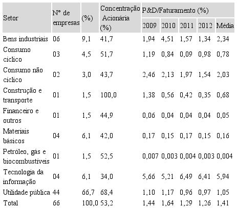 Este tópico apresenta os perfis das empresas brasileiras que, no período de 2009 a 2012, divulgaram em suas Notas Explicativas os investimentos em P&D. Na Tabela 1, é apresentada a relativização dos investimentos em P&D com o faturamento, bem como a concentração acionária das empresas distribuídas entre os setores da BM&FBovespa.
