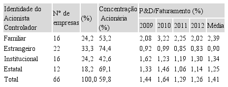 A Tabela 2 mostra a relação dos investimentos em P&D sobre o faturamento, bem como a concentração acionária das empresas a partir dos diferentes tipos de acionista controlador.