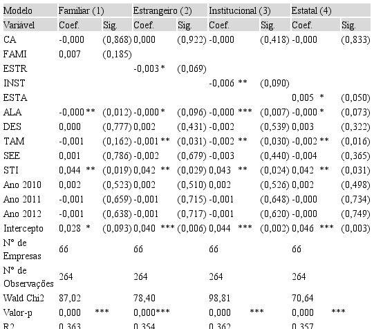 Conforme demonstrado, a forma mais adequada para a representação dos dados em painel da Regressão Linear Múltipla foi a abordagem em painel com efeitos aleatórios. Na Tabela 3, são apresentados os resultados da regressão entre a estrutura de propriedade e os investimentos em P&D.