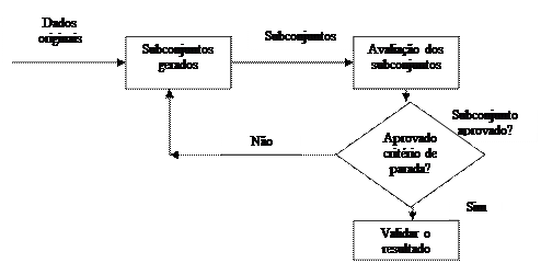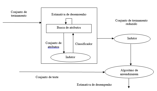 A abordagem wrapper ocorre externamente ao algoritmo básico de aprendizagem, porém, utilizando tal algoritmo como uma “caixa preta” para analisar, a cada iteração, o subconjunto de atributos em questão (Figura 3).