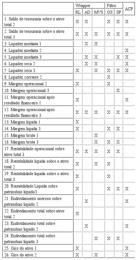 Das variáveis selecionadas pelas abordagens, quatro foram “determinadas” pelos métodos estudados (LS, MORF, STAT, ROAT), podendo levar à conclusão de que são aquelas com melhor capacidade para caracterizar as classes de empresas solventes e insolventes. Portanto, devem compor modelo de previsão de insolvência.