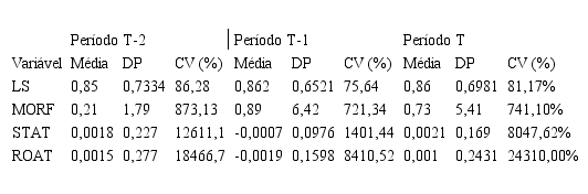 Quando se comparam os índices das empresas solventes com os das empresas insolventes, pode-se verificar que os coeficientes de variação, excetuando os de LS, apresentam distorções bem acentuadas nas empresas solventes, bem superiores aos das empresas insolventes. Já para as outras variáveis, média e DP, apresentam distorções, mas não tão acentuadas como os de CV. Talvez seja interessante um estudo mais detalhado sobre tais distorções, o que não é o objetivo desta pesquisa.