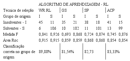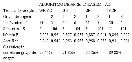 Na Tabela 3, pode ser constatado que a abordagem wrapper (WR RL) obteve os melhores resultados tanto na matriz de confusão como na medida F, na área ROC e na classificação correta do grupo de origem em que seu percentual foi de 89,88%.