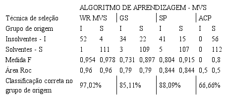 Cabe ressaltar que as variáveis STAT e MORF representativas do período mais próximo da insolvência foram selecionadas por todos os métodos estudados, o que evidencia o seu poder de representar aquelas empresas com alta probabilidade de vir a se tornarem insolventes.