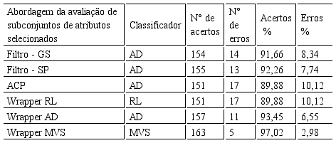 Pela Tabela 6, podemos comparar os resultados gerados pelos modelos compostos de atributos selecionados e avaliados pelas abordagens filtro, wrapper e análise de componentes principais. Os modelos elaborados pelos subconjuntos avaliados pela abordagem wrapper apresentaram melhores índices de classificação, em todos os classificadores estudados. Cabe ressaltar que a melhor performance foi com o classificador máquina de vetor suporte com 97,02% de classificação correta no grupo de origem, com as melhores medidas Fs e a área ROC.