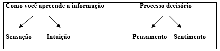 Carl G. Jung observou que existem duas maneiras opostas através das quais se percebem as coisas: Sensação e Intuição. Além disso, existem duas maneiras através das quais se julgam os fatos e se processam as decisões: Pensamento e Sentimento (Myers, 1995). A Figura 1 espelha essas ideias: