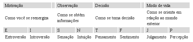 O tipo psicológico é determinado pelas quatro escalas de preferências, sendo elas: escala I (introversão) x E (extroversão), escala S (sensação) x N (intuição), escala T (pensamento) x F (sentimento) e escala J (julgamento) x P (percepção). A combinação das quatro escalas de preferência resulta em 16 tipos psicológicos (Myers, 1995; Myers e Myers, 1995; Myers et al., 1998), retratados no Quadro 2.