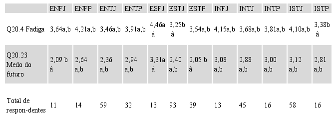 Sobre a percepção de medo do futuro, os executivos de tipo ESFJ (maioria alto escalão) demonstraram perceber mais esse tipo de manifestação. Novamente uma possível explicação para estes dados é que pessoas deste tipo se sentem desconfortáveis com conflitos e situações de tensão. Valorizam a segurança e a estabilidade. Conforme Fontes Filho (2006) identificou entre executivos, o medo relacionado à ameaça de substituição por pessoas mais jovens ronda os 40 anos.