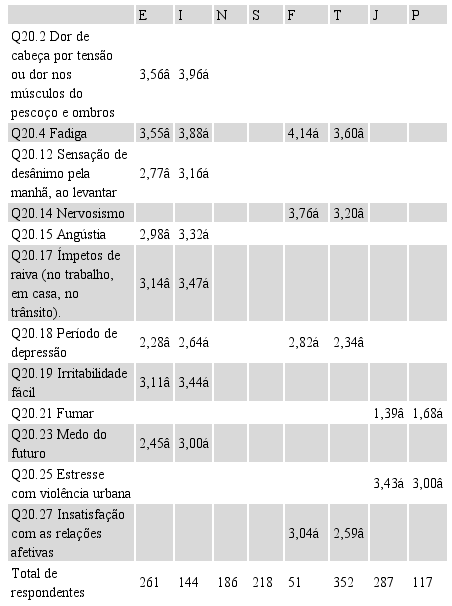 Ocorre também diferença significativa em relação à percepção de manifestações relacionadas ao estresse versus o MBTI desmembrado. Dentre as variáveis que apresentaram diferenças significativas quanto ao resultado MBTI, os tipos que apresentam os sintomas de estresse mais frequentemente são “I” e “F”, conforme a Tabela 2.