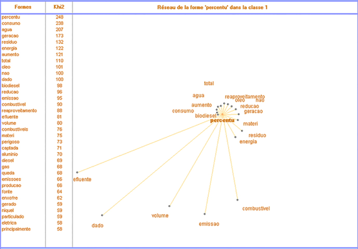 Vê-se que, no centro da Figura 2, estão concentradas as palavras: “óleo”; “redução”; “geração”; “material”; “resíduo”; “energia; “total”; “água”; “aumento”; “consumo” e “biodiesel”, todas elas agrupadas em torno da palavra “percentu”, fazendo referência a percentual.