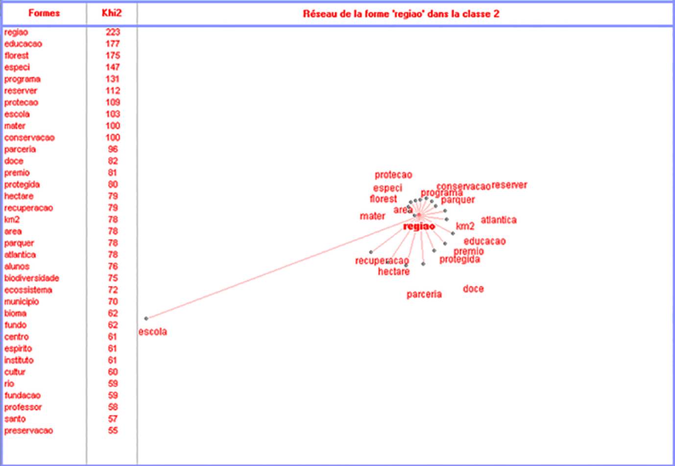 As palavras mais representativas da Classe 2 estão apresentadas na coluna à esquerda e conforme dados da Figura 3. A palavra mais representativa da Classe 2 é “região” com Q² de 223, seguida de “educação” de Q² 177 e de “florest” com Q² igual a 175. Outras palavras que também representam a classe seriam “proteção” e similarmente as palavras “protegida”; “conservação”; “parceria”; “prêmio”; “recuperação” e “preservação”, no centro da Figura 3, ou ainda por ordem decrescente de valor do Q² conforme sua listagem na área esquerda da Figura 3.