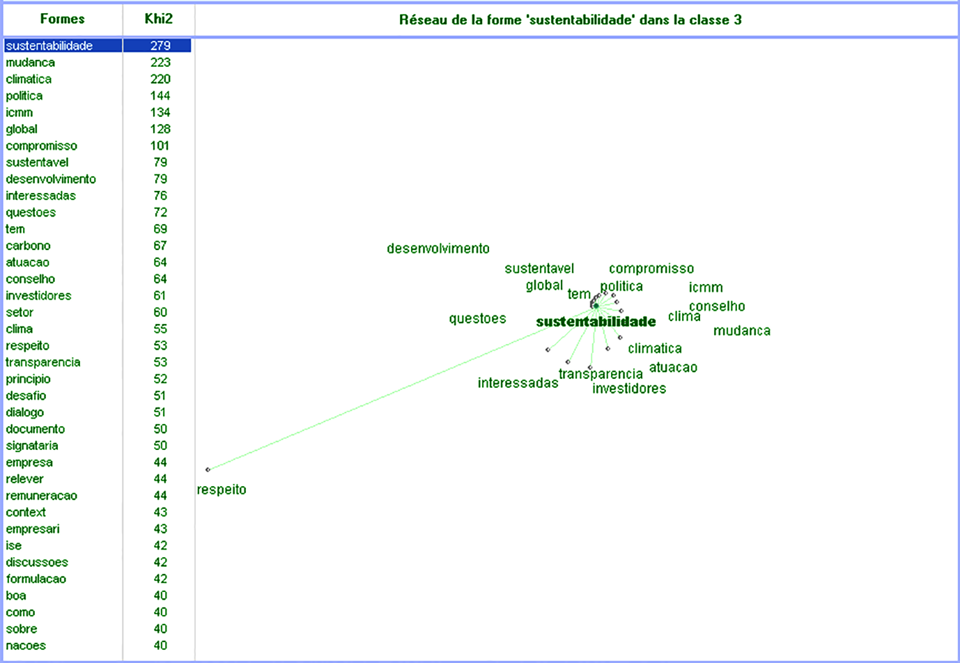 Na Figura 4, pode-se verificar que a palavra mais representativa da Classe 3, e por conseguinte do Relatório de Sustentabilidade de 2010, é “sustentabilidade”, com Q² de 279. As demais palavras também significativas são “mudança”, com Q² 223; “climática”, de Q² 220; “política”, de Q² 144. Também são citadas palavras como “compromisso”, “sustentável”, “desenvolvimento”, “investidores”, “transparência” e “respeito”.