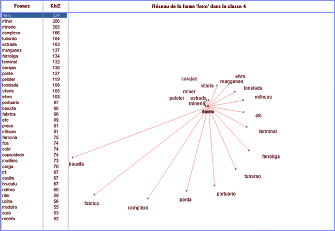A Classe 4, representada pela Figura 5, possui como palavra mais representativa “ferro”, com Q² de 324; o fato da palavra principal da classe possuir estreita relação com a atividade operacional da empresa representa que todo o contexto presente nesta classe gira em torno da atividade fim da empresa estudada. Entre as outras palavras representativas estão “miner”, com Q² de 206, e “minério”, de Q² 202. Outras siglas das empresas controladas também são citadas, porém não convém expor o nome das empresas em razão do sigilo da identificação adotada neste trabalho.