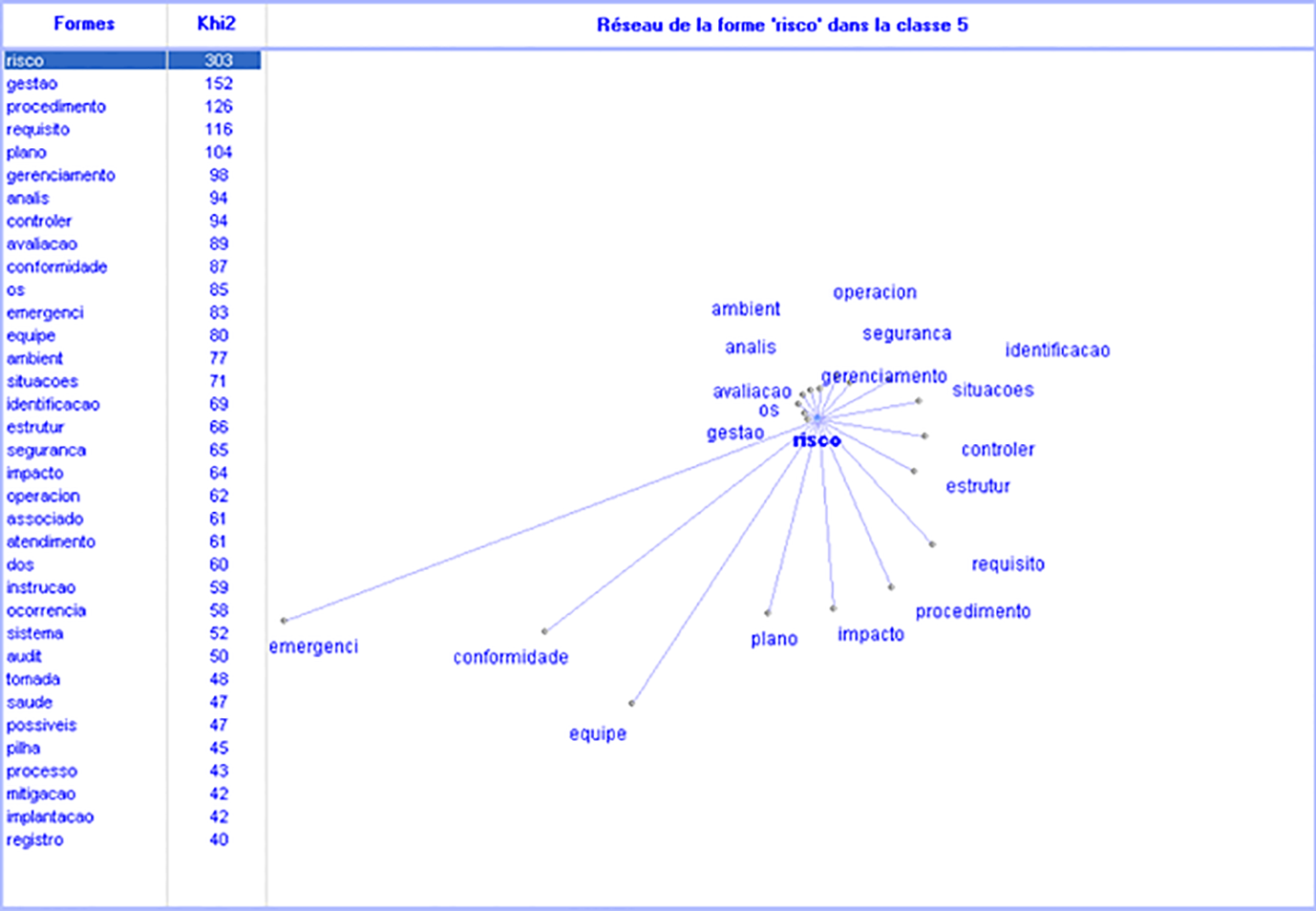 A palavra central, ou seja, mais representativa na análise fatorial, com Q² de 303, é “risco”. As demais palavras que expressam o contexto da Classe 5 são “gestão”, com Q² de 152; “procedime”, de Q² igual a 126; “requisito”, com Q² de 116. Outras palavras são “controler”; “gerenciam” fazendo referência a gerenciamento; “avaliação”; “conformid” representando conformidade; “emergenci”; “operacion” no sentido de operacional; “impacto”, “segurança”, dentre as demais elencadas no lado esquerdo da Figura 6.