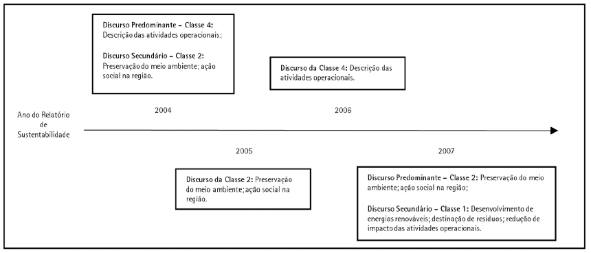 O Relatório de Sustentabilidade de 2007 possui um discurso pautado predominantemente pela Classe 2 e complementarmente pela Classe 1. A Classe 2 já foi discutida e aborda a questão da preservação em parques ambientais, assim como o desenvolvimento de programas e ações de proteção ambiental na região. A Classe 1 também está presente no relatório de 2007, que trata de como a empresa busca fontes renováveis de energia para a minimização dos impactos que sua atividade operacional pode vir a causar. Isso tudo com foco na redução no consumo de energias poluentes e maior utilização de fontes renováveis, fato que evidencia uma busca pela legitimação no tocante à minimização dos impactos de suas atividades operacionais no meio ambiente.