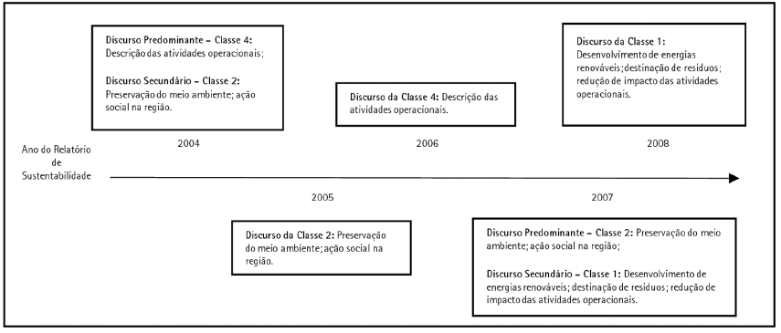 A análise dos dois anos anteriores ao acidente em Leopoldina permite inferir que havia dois tipos de discurso. O Relatório de Sustentabilidade de 2004 tratava tanto sobre as atividades operacionais (Classe 4) quanto, em menor escala, sobre preservação ambiental (Classe 2), e, em 2005, o Relatório de Sustentabilidade possuía características marcadamente relacionadas à temática ambiental (Classe 2). No entanto, o fato da empresa ter enfatizado mais o discurso sobre preservação ambiental em 2005 em comparação a 2004 pode ser devido ao acidente de 2005.