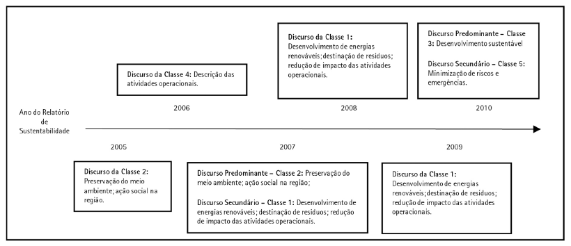 O contexto de discurso da Classe 5 está presente nos Relatórios de Sustentabilidade dos anos de 2010, 2006 e 2009. No entanto, diferentemente do visto em outras classes, o conteúdo da Classe 5 não é predominante em nenhum dos Relatórios de Sustentabilidade em detrimento de outras classes. Isso ocorre em razão do baixo valor encontrado no Q², já que em 2010 o Q² foi de 19; em 2006 de Q² 8 e em 2009 de Q² 4, ou seja, a Classe 5 é um discurso complementar presente nos relatórios citados.