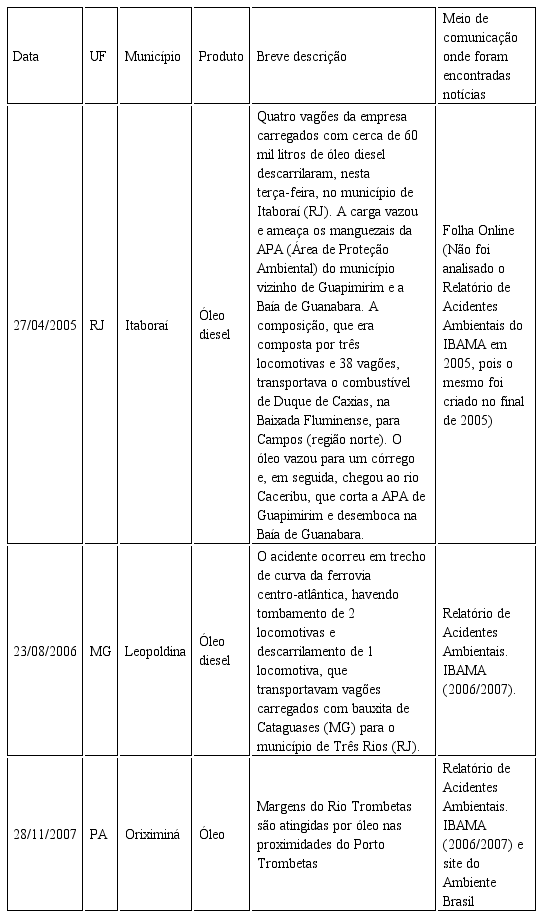 A pesquisa chegou aos acidentes ambientais por meio do Relatório do IBAMA de 2006, de 2007 e de sites de busca na internet elencados no Quadro 1.