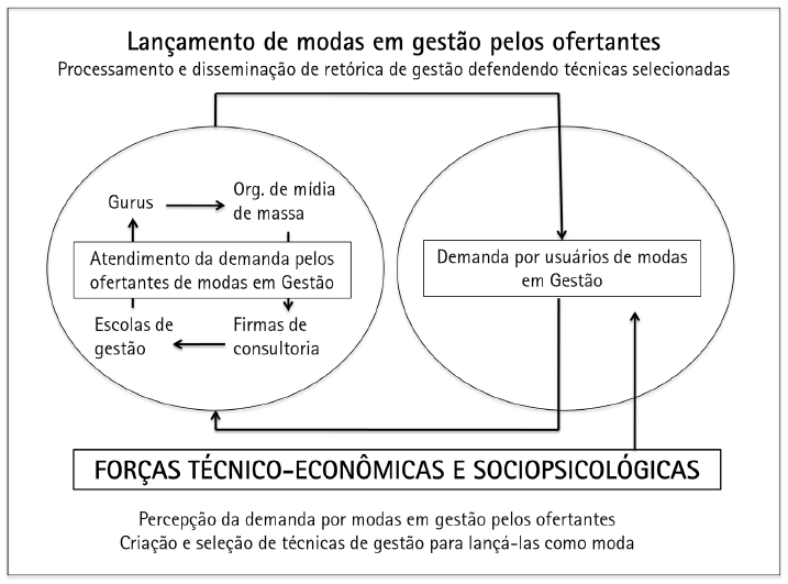 A framework de Abrahamson (1996) apresenta o processo de criação de modas de gestão. Nesta framework, Abrahamson (1996) indica o papel das empresas de consultoria, das escolas de gestão, dos chamados “gurus” e a própria mídia como os defensores e divulgadores destes modismos.