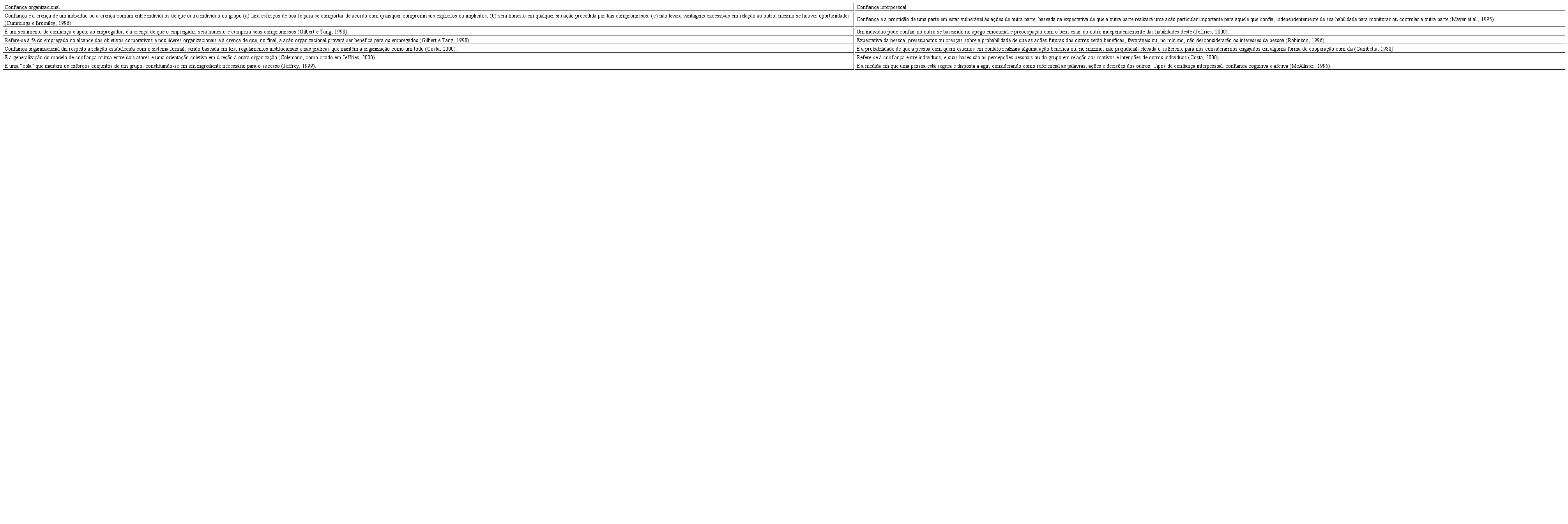 No que se refere à confiança organizacional, segundo Costa (2000), ela diz respeito à relação estabelecida com o sistema formal, sendo estando baseada em leis, regulamentos e nas práticas que mantêm a organização como um todo. A autora enfatiza, considerando o caráter anônimo dos sistemas, os aspectos cognitivos e racionais da confiança organizacional. Ainda, tratando-se dos conceitos de confiança interpessoal e confiança organizacional, a fim de verificar as formas como os diversos autores os operacionalizam, apresenta-se a Tabela 2.