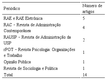 O conceito de confiança aplicado a organizações é um tema muito difundido nos estudos internacionais. No Brasil, entretanto, o tema não encontra a mesma relevância e frequencia. Na base de pesquisa SPELL® Scientific Periodicals Electronic Library, http://www.spell.org.br/, que contém artigos de mais de 80 periódicos com estratos (Qualis/Capes) B3 a A2 nacionais, foram identificados em 27/10/2014 um total de 78 artigos relacionados à confiança, estando relacionados às áreas de finanças, marketing e estratégia. Relacionados diretamente com comportamento organizacional e a temática desse artigo foram identificados 37 artigos. As publicações foram: 1 em 1995, 2 em 2003, 1 em 2004, 1 em 2005, 3 em 2006, 2 em 2007, 2 em 2008, 2 em 2009, 3 em 2010, 8 em 2011, 2 em 2012, 7 em 2013 e 5 em 2014, ou seja, número reduzido, pois foram publicados 27.172 documentos. Foram pesquisados os últimos dez anos em revistas nacionais indexadas no Scielo, onde foram encontrados apenas 14 artigos sobre o tema, conforme apresenta a Tabela 3.