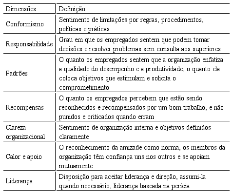 Schneider e Snyder (1975) reforçam isso quando descrevem que clima organizacional não pode ser considerado um conceito unidimensional, pois muitos eventos, práticas e procedimentos podem contribuir para uma nova percepção dos empregados sobre a organização. Assim, reafirmam que o clima é composto por uma série de dimensões que podem ser avaliadas levando em consideração uma série de condições inter-relacionadas.
