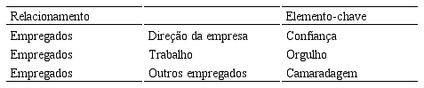 Esses relacionamentos são interconectados e se fundamentam em alguns elementos-chave. É possível verificar que, para Levering, o relacionamento entre os empregados e a direção da empresa tem como elemento fundamental a confiança; para ele, esse é o elemento mais importante na criação de um bom lugar para se trabalhar.