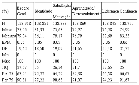 Os escores de cada domínio/dimensão: Id/Sat/Apren/Des/Líder, Confiança e o Escore Geral correspondem às médias das respostas dos itens referentes a cada domínio. Os escores foram obtidos para cada indivíduo pela média dos valores dos itens correspondentes (escala de 1 a 5). Estes indicadores/escores foram todos transformados para a escala de 0 a 100 (%) para que, com esta padronização, ficasse mais claro o “tamanho” de cada domínio. Esta transformação foi feita para cada indivíduo i (i = 1,2,…, 138.918) pela razão entre a diferença do escore do individuo i e o valor mínimo obtido e a diferença entre o valor máximo e mínimo obtidos (escorei – min(escore))/(max(escore) – min(escore)), o que nos dará para cada indivíduo uma fração variando de 0% a 100%.