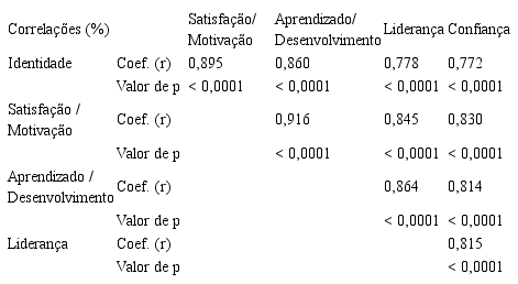 Por estarem forte e positivamente correlacionados, o resultado de um componente influencia no resultado dos demais e todos contribuem para o resultado geral do clima organizacional das organizações pesquisadas. Dessa forma, é possível afirmar que a percepção sobre confiança organizacional e interpessoal interfere no resultado geral do clima organizacional das empresas pesquisadas. Sendo assim, se ela apresentar índices mais favoráveis, o clima também terá seu escore geral aumentado.