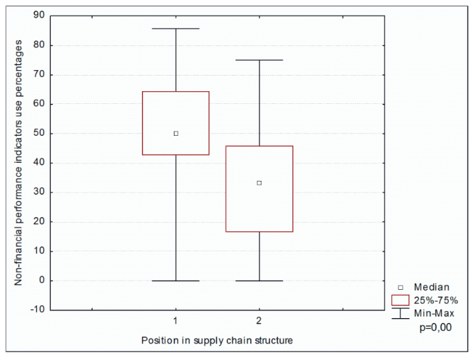 Secondly, data obtained from the individual companies investigated was used to analyze the statistical significance of relations between non-financial performance indicators use percentages and the position of individual companies in the supply chain structure. Descriptive statistics relating to non-financial performance indicators using percentages among input suppliers and producers are present in Table 9.